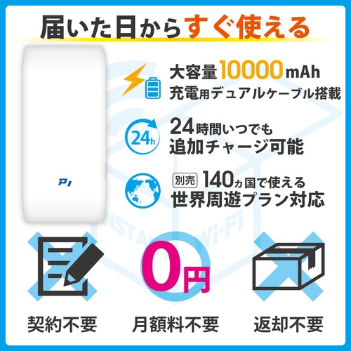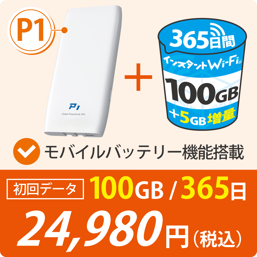 ![【数量限定:データ増量】[インスタントWi-Fi]P1 モバイルバッテリー機能付きモバイルWi-Fi 100GB(有効期間365日間) 回線プラン入りWi-Fi端末セット](https://baseec-img-mng.akamaized.net/images/item/origin/0a3699f08c3f7635b1c2d2d87647b30a.png?imformat=generic&q=90&im=Resize,width=500,type=normal)