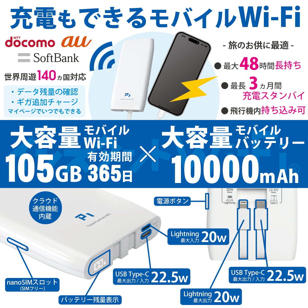 【数量限定:データ増量】[インスタントWi-Fi]P1 モバイルバッテリー機能付きモバイルWi-Fi 100GB(有効期間365日間) 回線プラン入りWi-Fi端末セット