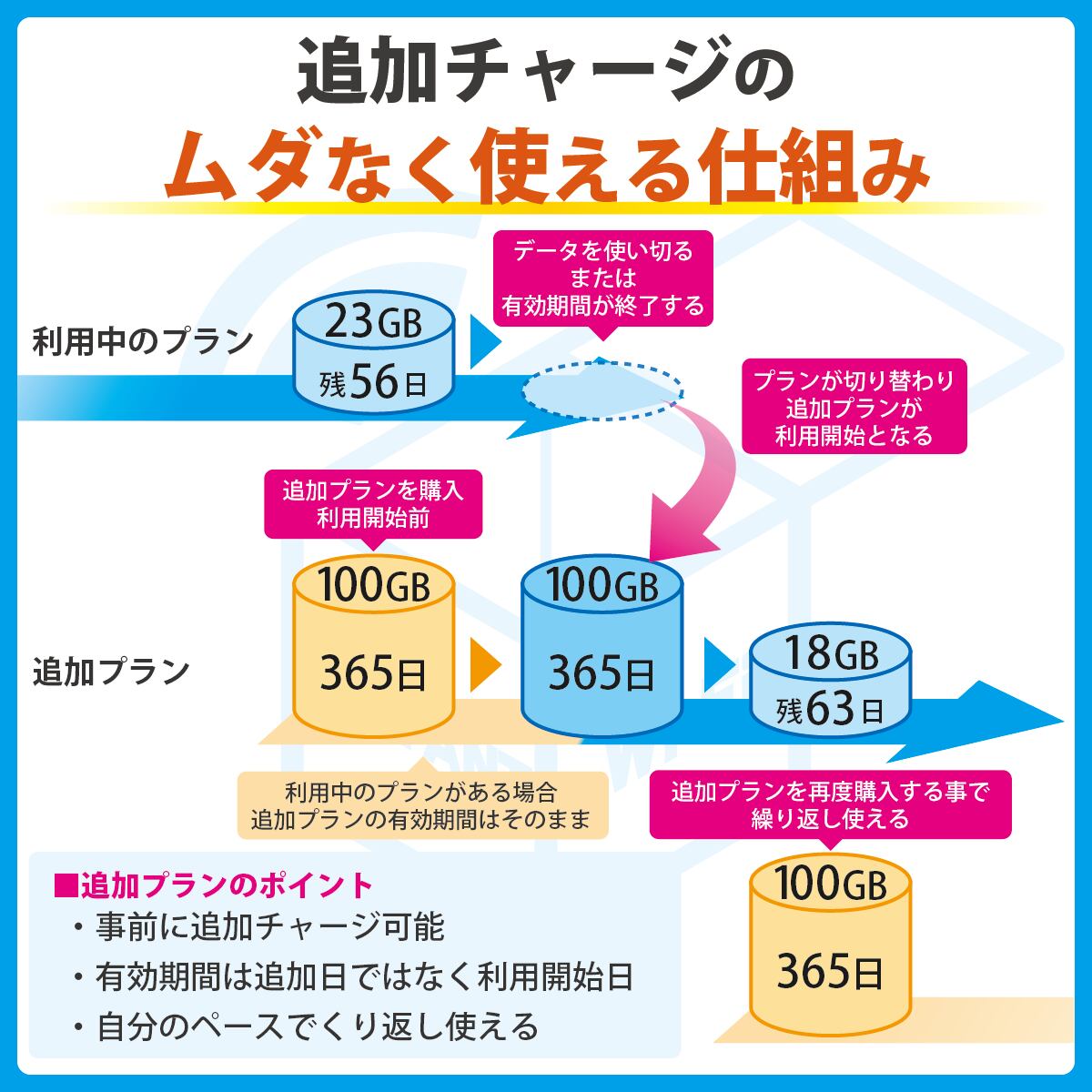 ※追加の5GBは最初の100GBプランを使い切った後に自動で切り替わります。(最初に5GBプランから利用開始となる場合がありますが、その場合は5GBプランを使い切ったタイミングで100GBプランへきりかわります。)