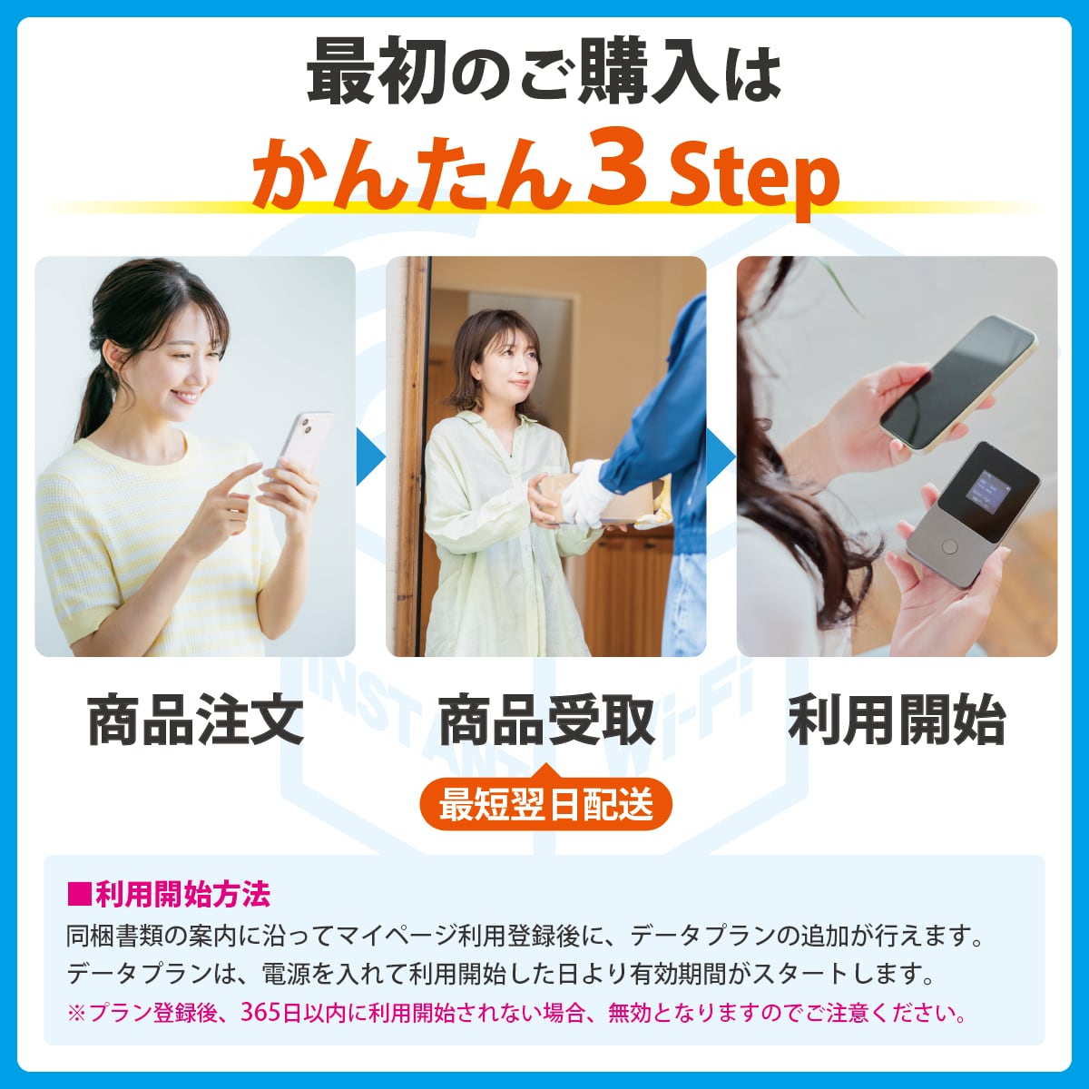 ギガも端末も「買うだけ」の即席モバイルWi-Fiの、届いてすぐに使える端末+105GBのセットです。